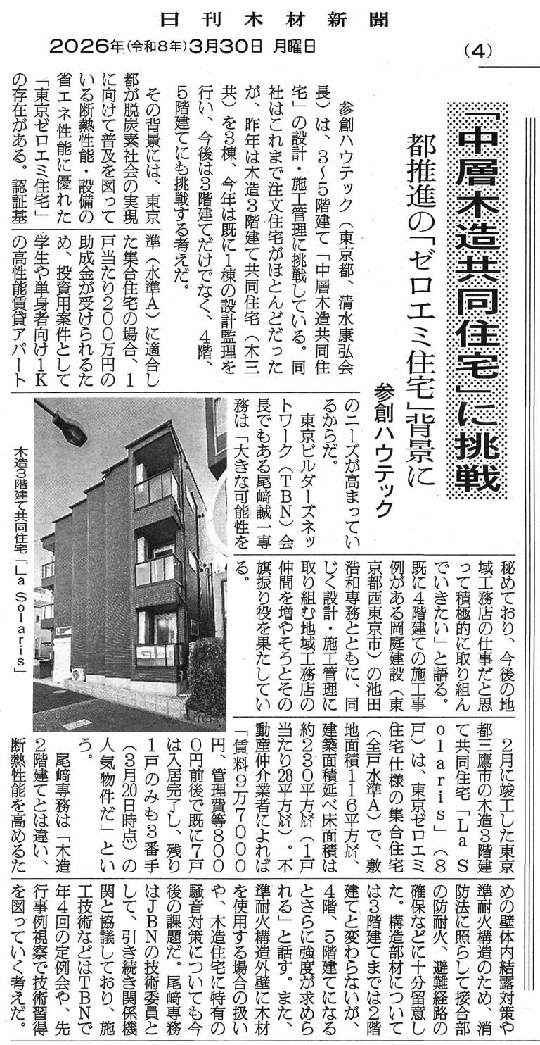 2026年(令和8年)3月30日付の日刊木材新聞に、弊社専務取締役 尾崎の取材記事が掲載されました。「中層木造共同住宅に挑戦」と題し、東京ゼロエミ住宅への取組など、ご紹介いただきました。