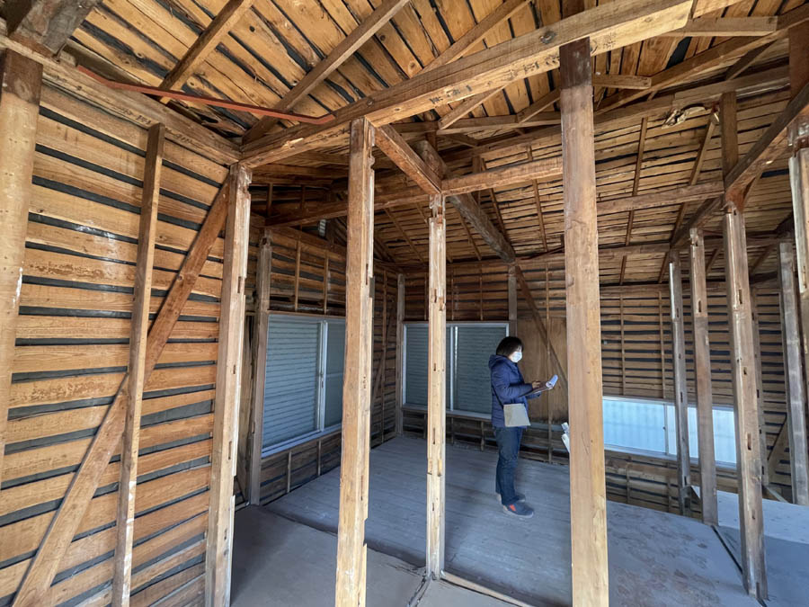 解体工事が終わり、工藤さんが構造体をチェックしています。