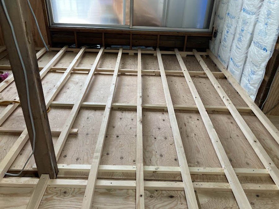 1階は基礎補強のため床と床下地を撤去しています。床下の配管のために基礎が一部壊れています。基礎補強して頑丈にしていきます。