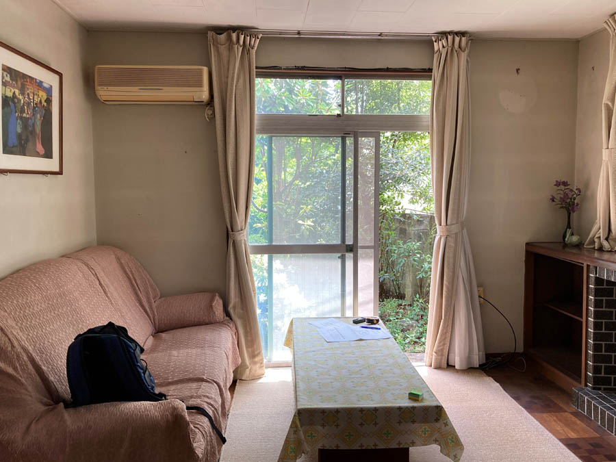 住宅地の真ん中に、旗竿敷地で二方向が川と遊歩道に面したちょっと高台に建つ、駅近としてはかなり希少な立地のこの家をみつけて、運がいいことに、接道が取れてなく再建築不可の物件で格安で購入ができました。