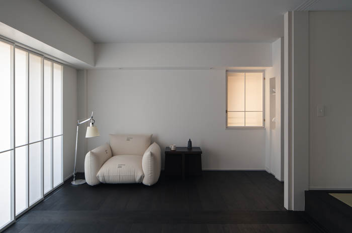 もとの部屋が持っていた「暗さ」をひとつの質として受け止め、自然光を様々なテクスチャを持った白い壁や天井によってやわらかく拡散させることで、暗さを心地よく受け止められるように設計されています。