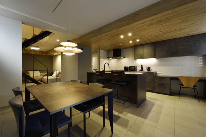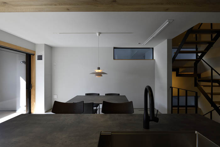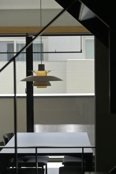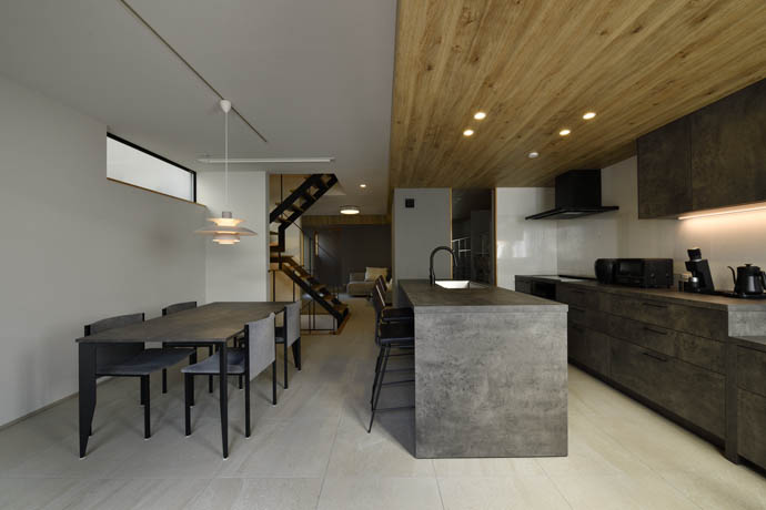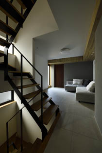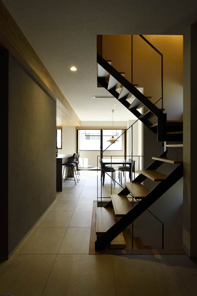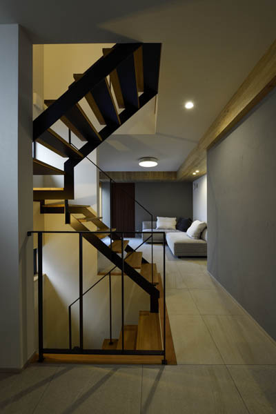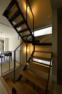 鉄骨フレームと木のステップを組み合わせたオープン階段。スケルトン構造が縦方向への視線の抜けをつくり、3階建ての空間に奥行きと開放感をもたらしています。