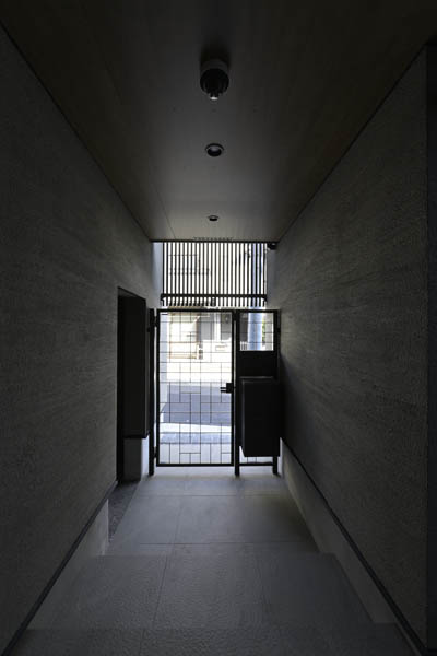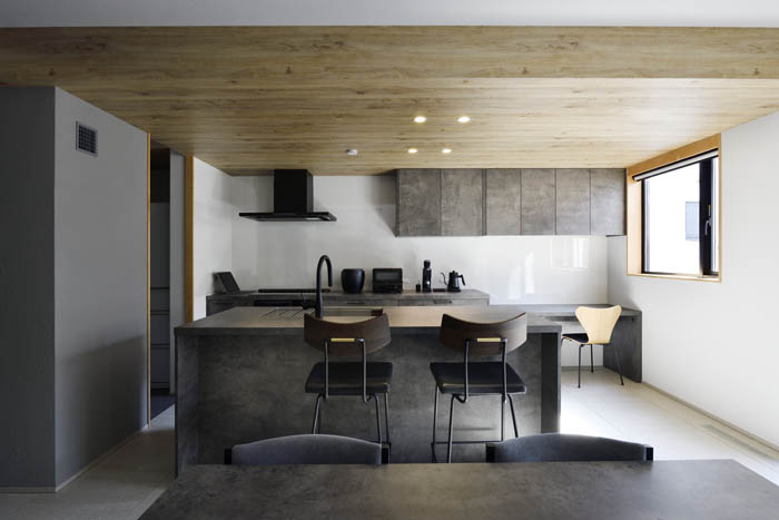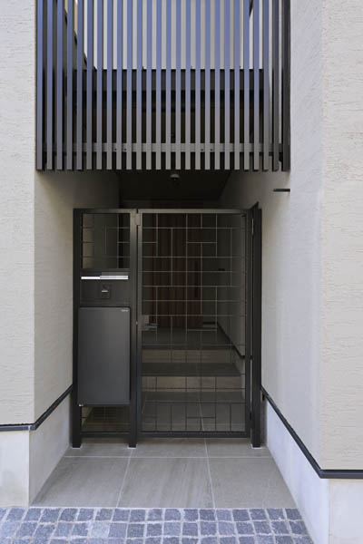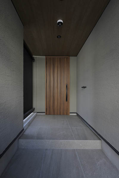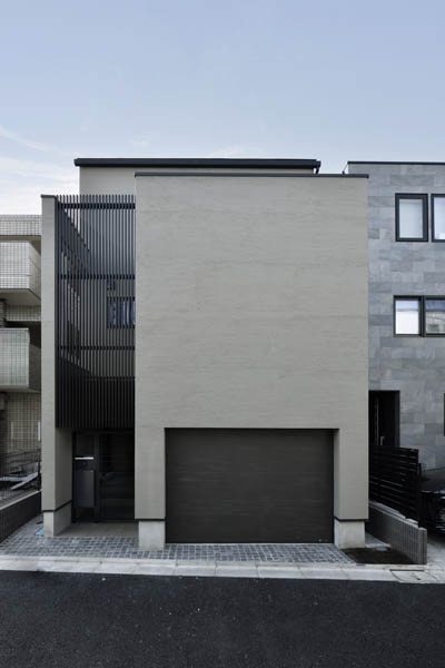 塗り壁仕上げの外壁に、ガレージシャッターと縦格子のルーバーを組み合わせたシンプルな外観構成。余分な装飾を排したフラットな正面が、建物ボリュームを整然と見せています。