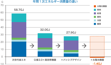 このグラフは「ある住宅モデル」を想定したときのエネルギー消費量を試算したものです。