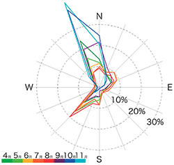 東京の夜間の風配図 風のデザインがとくに重要なのが夏の夜です。外気温が低くなった夜に、しっかりと風を通すことによって、エアコンに頼らずに寝ることができるようになります。そのために、夏の夜の卓越風向を必ず意識した寝室や子供室のデザインを行ないます。