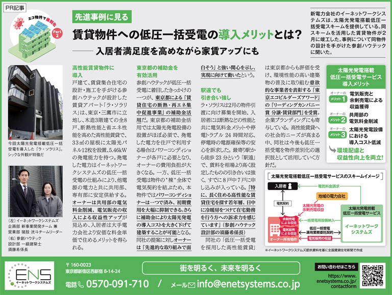 2026年(令和8年)3月2日付の全国賃貸住宅新聞に掲載された新電力会社「イーネットワークシステムズ」様のPR記事に、弊社設計部の須藤(一級建築士)が取材協力いたしました。
