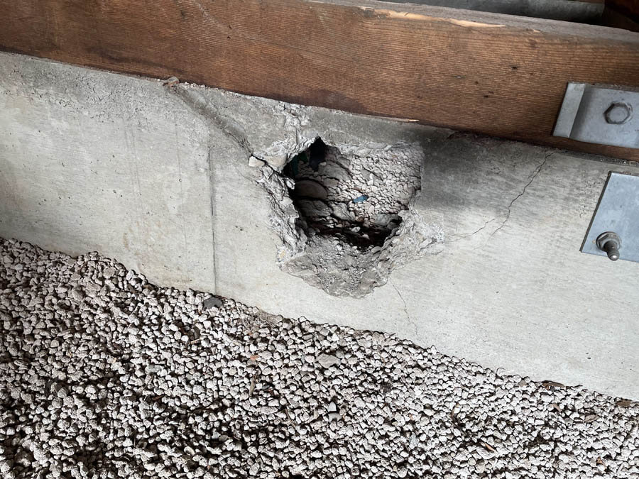1階は基礎補強のため床と床下地を撤去しています。床下の配管のために基礎が一部壊れています。基礎補強して頑丈にしていきます。
