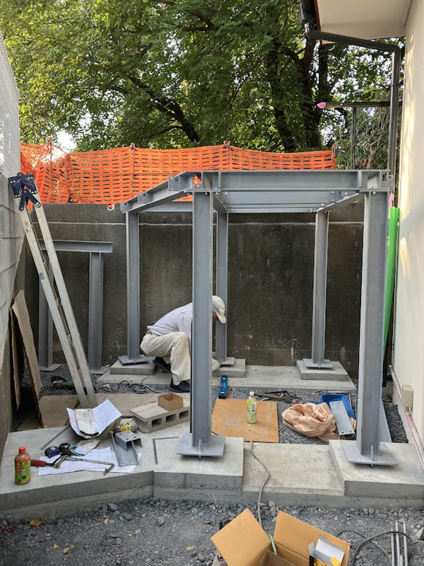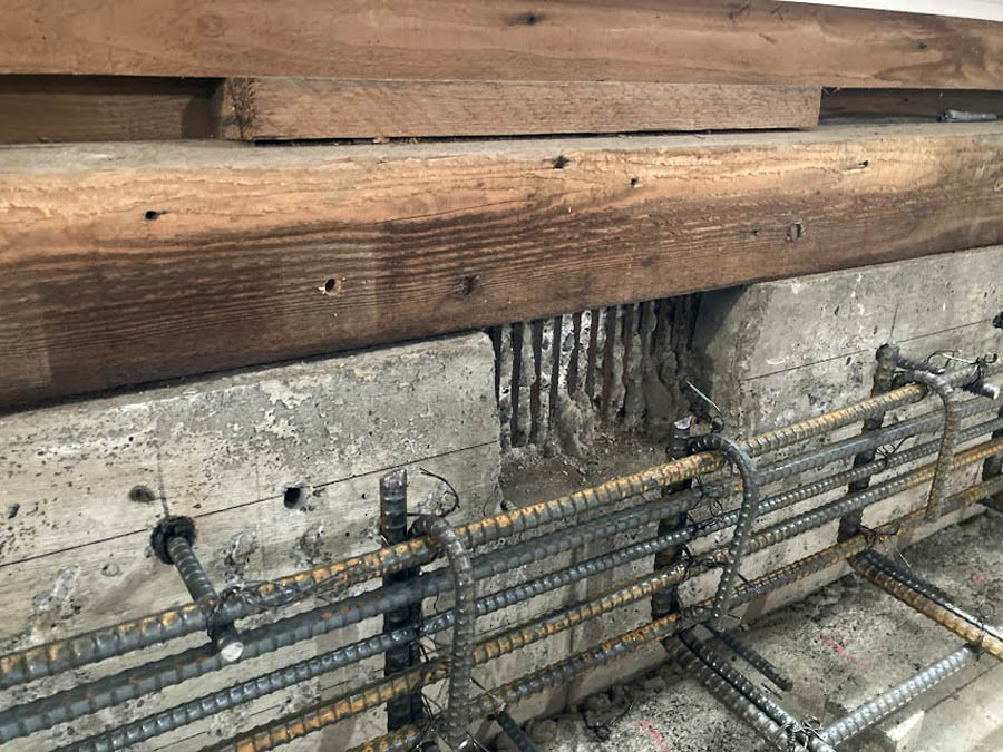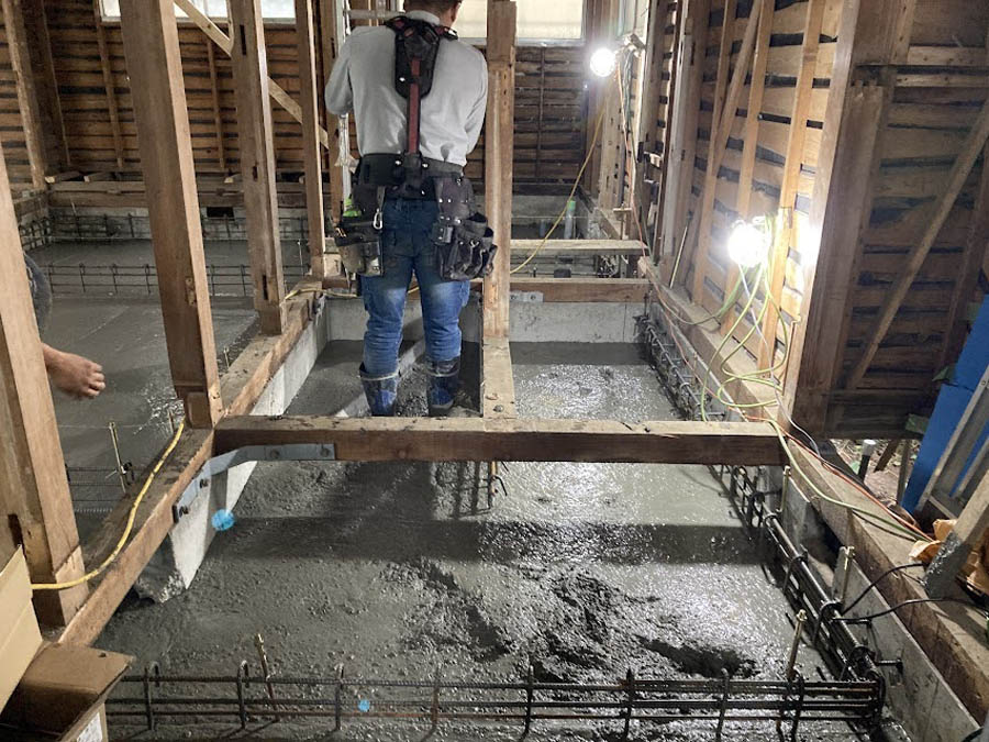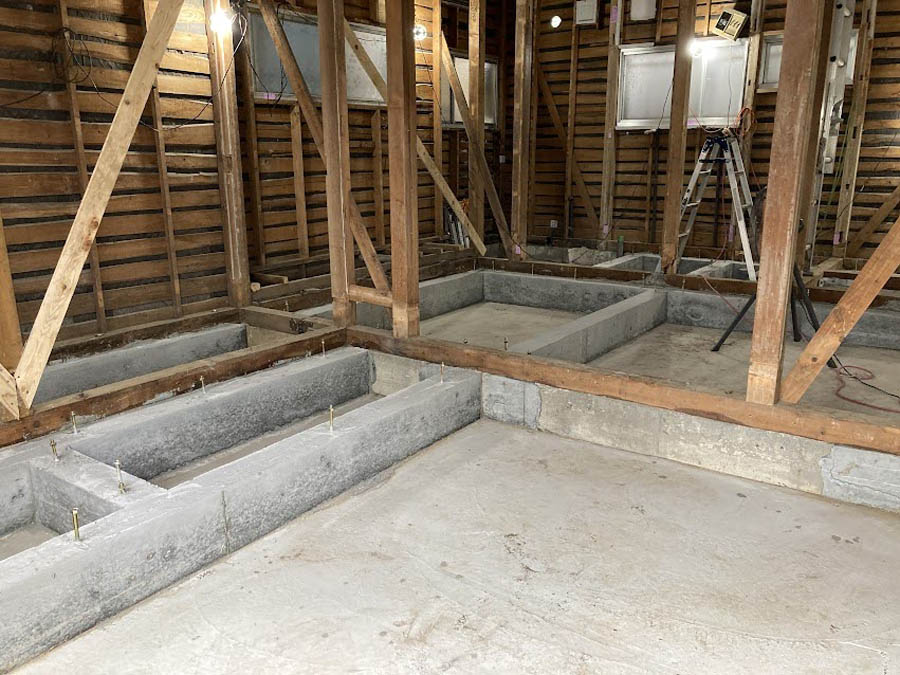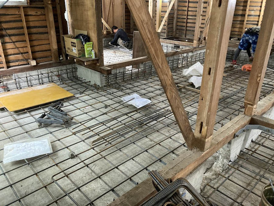まず基礎補強のため、耐圧部分と添え基礎部分の鉄筋工事を進めます。既存の基礎はベースのない立上りのみの基礎(無筋)だったので、ベタ基礎(耐圧版と添え基礎)で工事を進めます。コンクリートを打設し、補強基礎が完成しました。