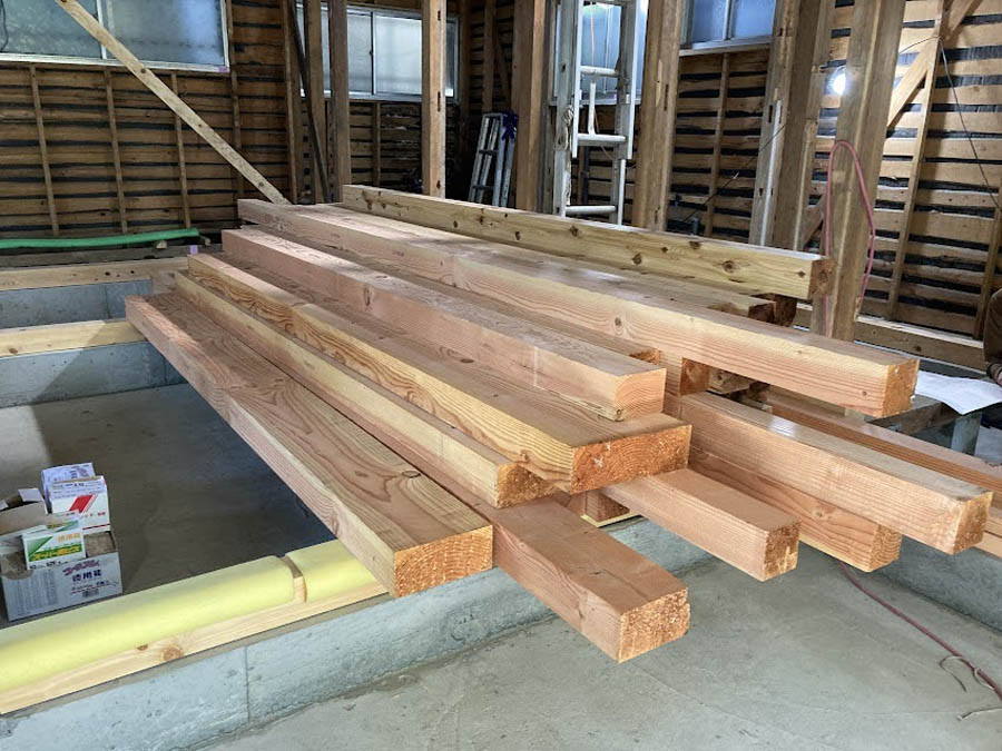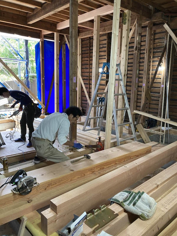 昔の梁は細いので、梁を追加して屋根や2階床の荷重を支えます。補強には木材をきざみ、現況の構造にしっかりと合わせていきます。