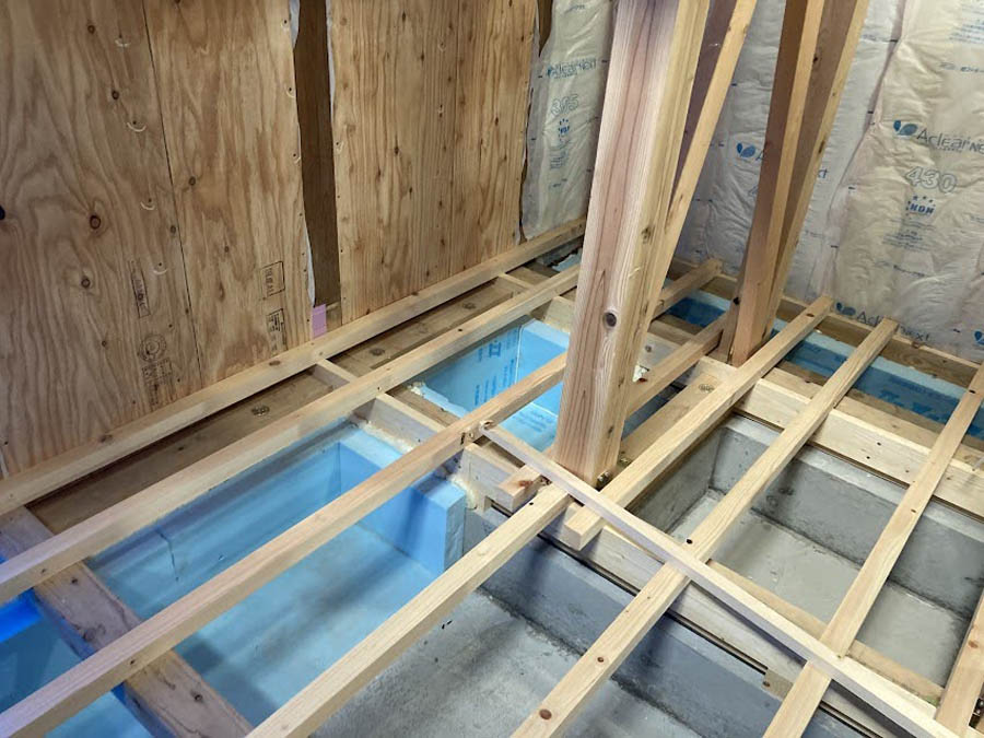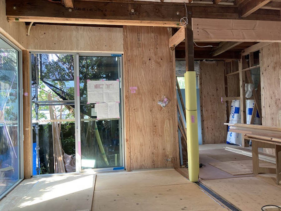 基礎は既存基礎に新たな基礎を添える形で行い、梁強度が足りない部分には梁を追加したり、金物も必要箇所には追加しました。耐力壁は内部からの補強のみで、基本的には構造用合板を使用し、面で支える方法としました。