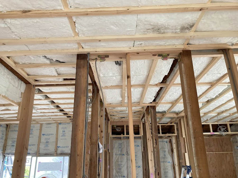 2階天井面は厚さ210mmの高性能グラスウールで屋根からの遮熱を実現します。最近の夏はとても暑いので、断熱材をいれることで、エアコンが効きやすくなります。