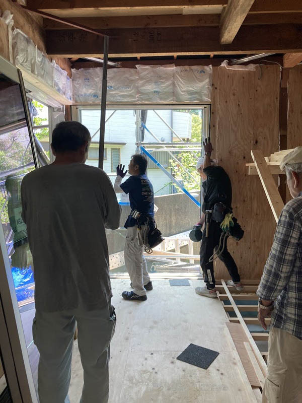 サッシの取付です。新設でサッシを取り付ける場所と既存窓に内窓をつける箇所があります。新設の窓は断熱性能が高く、ガラスが2重のLow-Eガラスでとても重いです。職人皆で持ち上げ取り付けていきます。