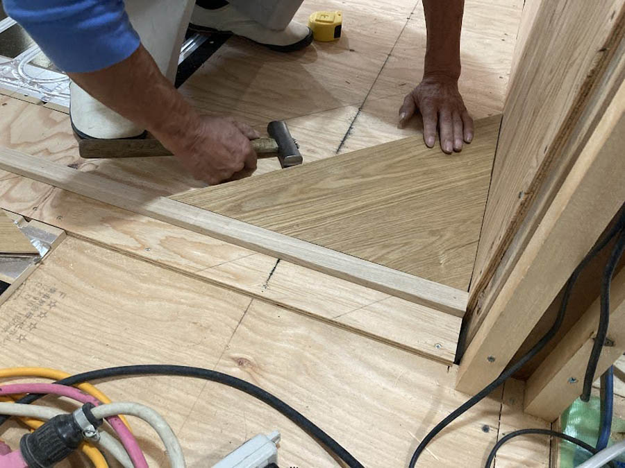 フローリングを施工しています。斜め貼りなので綿密な作業となります。