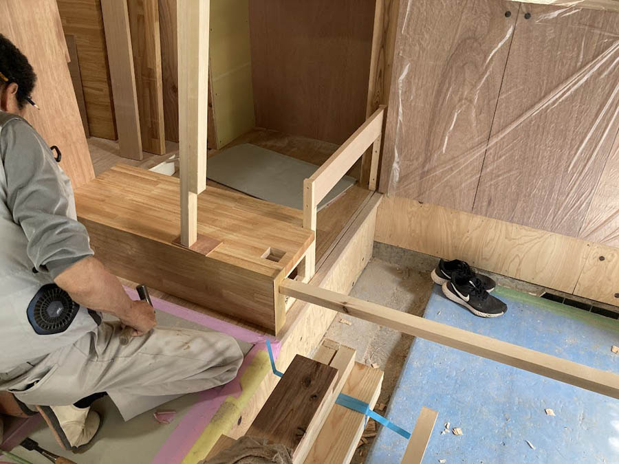 天井ボード張りと階段を施工しました。階段工事は計算しながら寸法を出していきます。手摺と階段下収納が絡んでいるため、とても慎重さが求められる工事です。
