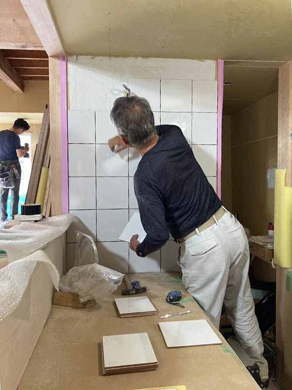 キッチンの横壁にタイルを貼っているところです。裏の緑道から敷地に接続できるように外階段を作りました。