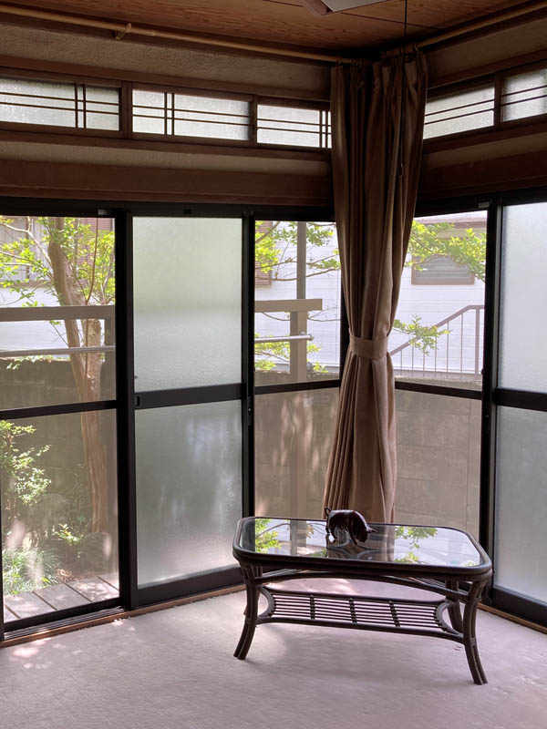 住宅地の真ん中に、旗竿敷地で二方向が川と遊歩道に面したちょっと高台に建つ、駅近としてはかなり希少な立地のこの家をみつけて、運がいいことに、接道が取れてなく再建築不可の物件で格安で購入ができました。