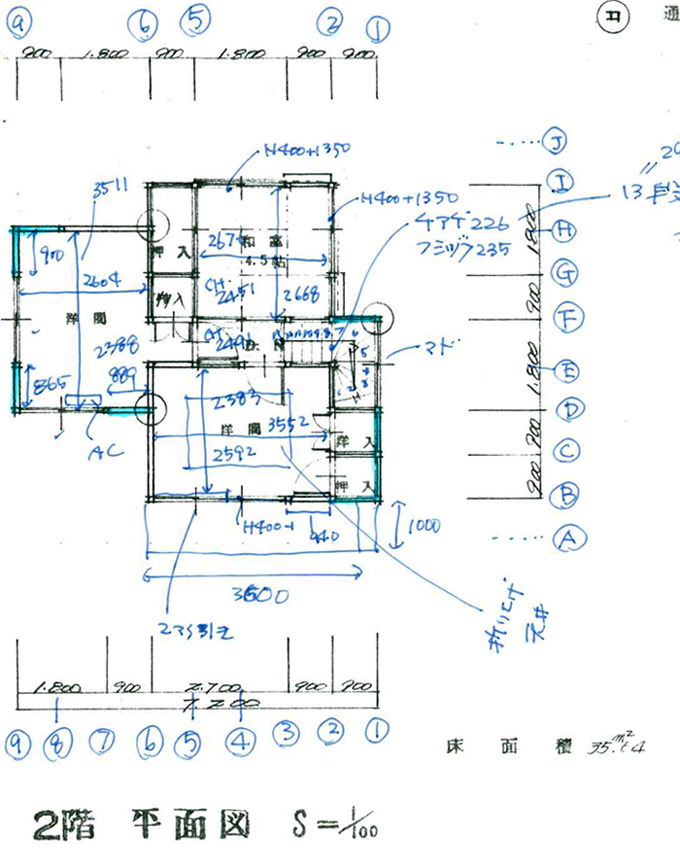 住宅調査を元に設計がはじまりました。M様は建築系のお仕事をしています。間取りやデザイン等は、M様の希望を伺い、工藤さんがまとめていきます。