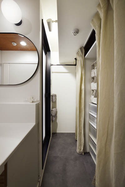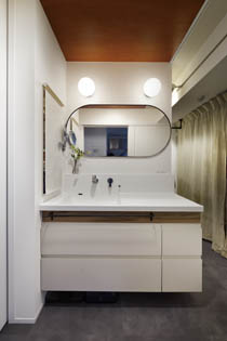 水廻りも一新し、清潔で美しい空間に仕上げました。帰宅後の手洗い、入浴、着替えの動線や洗濯時の洗う、干す、畳む、しまうの動線を考慮し、共用のクローゼットを脱衣室内に設け、カーテンで仕切りました。