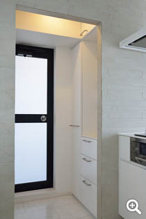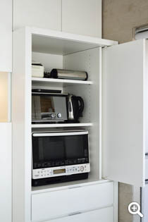 キッチンの収納も綿密にプランニングしましたので、日常使いの食器や食料品・調味料などがすっきりと機能的に納められています。調理家電の収納も扉を閉めればまるで家具のよう。
