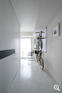 リビングからエントランス方向を見たアングル。壁掛けしたご夫妻の自転車が粋なアクセントに。水廻りエリアの朱色の壁が白い空間を引き立たせています。