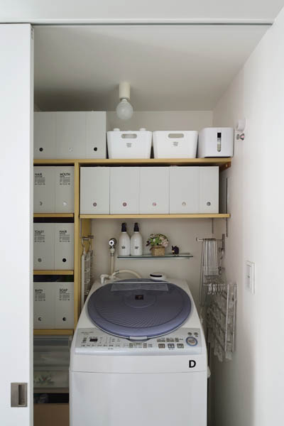 バス・トイレ・洗面をひと続きにまとめ、まるで高級ホテルのように美しくまとめられた水廻りエリア。トイレの横に設置した洗面台の引き出しに、トイレットペーパーやリモコンをすっきり格納するなど工夫が満載です。洗濯機コーナーの収納も完璧!