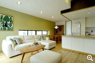 SE構法+外張断熱工法を採用。開放的な大空間と快適な温熱環境を実現した住宅です。ピスタチオグリーンの壁とPHランプがご夫妻の団欒のひとときに安らぎを演出。キャラメル色のカウンターがナチュラルな雰囲気を醸し出すキッチンは、ekreaオーダーキッチンならではのこだわり仕様。