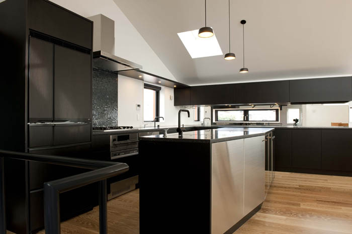 キッチンはekrea(エクレア)のオーダーキッチンを採用。黒とステンレスの組み合わせの美しさが絶妙です。また、窓の配置による採光の工夫により、明るい陽射しが部屋中に行き渡り、冬でも暖かく暮らすことができます。