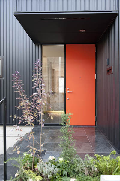 ワークスペースには収納量が豊富な書庫を造作で設えました。また、シックなモノトーンの外観には扉や窓枠にビビッドなオレンジをアクセントで使うなど、奥様のセンスが光ります。