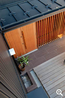 玄関はウッドデッキに面しているため広々と開放的。上質な和の雰囲気を醸し出す両開きのドアと格子がポイントです。玄関土間と一体の空間としてすっきりと上品なデザインでまとめています。