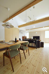 2階はたっぷりと陽射しが注がれるひと間続きのLDK。お気に入りの家具をゆったりと配し、移り変わる陽光を眺めながらのんびりと過ごすのがまたいい具合。少し暑さがこもる時は、吹抜のハイサイド窓を開放すると爽やかな風とともに暑さを掃き出します。