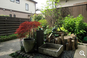 バスルームは坪庭に面して配置。景色を眺めながらくつろげます。使われていなかった井戸もポンプを設置して復活させ、昔懐かしい人研ぎの流し台を再利用して庭のアクセントにしています。