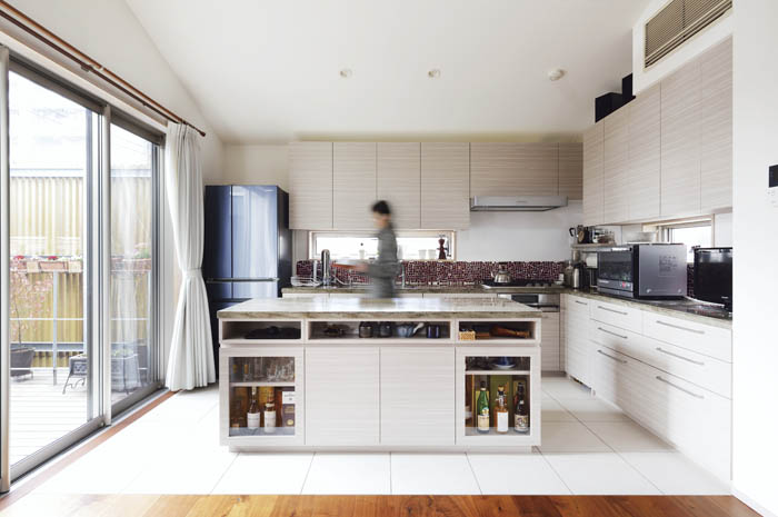 キッチンは白でまとめたekreaのオーダーキッチン。モザイクタイルでアクセントを加えてお洒落なテイストに仕上げました。