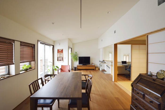 明るい陽射しが降り注ぐ2階のキッチン&ダイニング。愛用の家具や調度品が馴染むようシンプルで落ち着いた雰囲気に設えました。一角には和室コーナーがあり、障子を閉めると個室にもなります。
