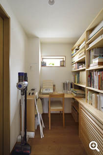 階段を上がって和室の横にはご主人様の書斎コーナーを配置。たくさんの本がきれいに収納されています。